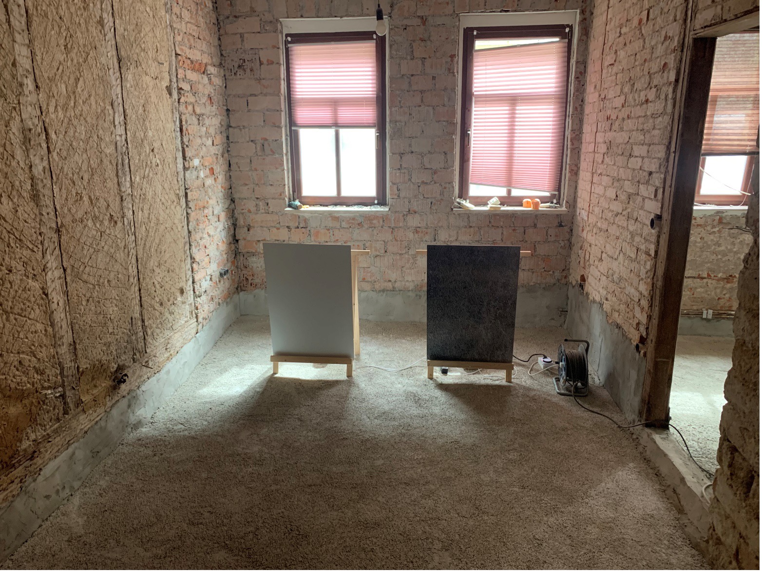 Im Messzeitraum von 4 Wochen trocknete der Boden in diesem Zimmer schneller als im Raum rechts daneben. 2 Wochen nach dem Einbringen der Bodendämmung wurde mit diesem Versuchsaufbau begonnen.